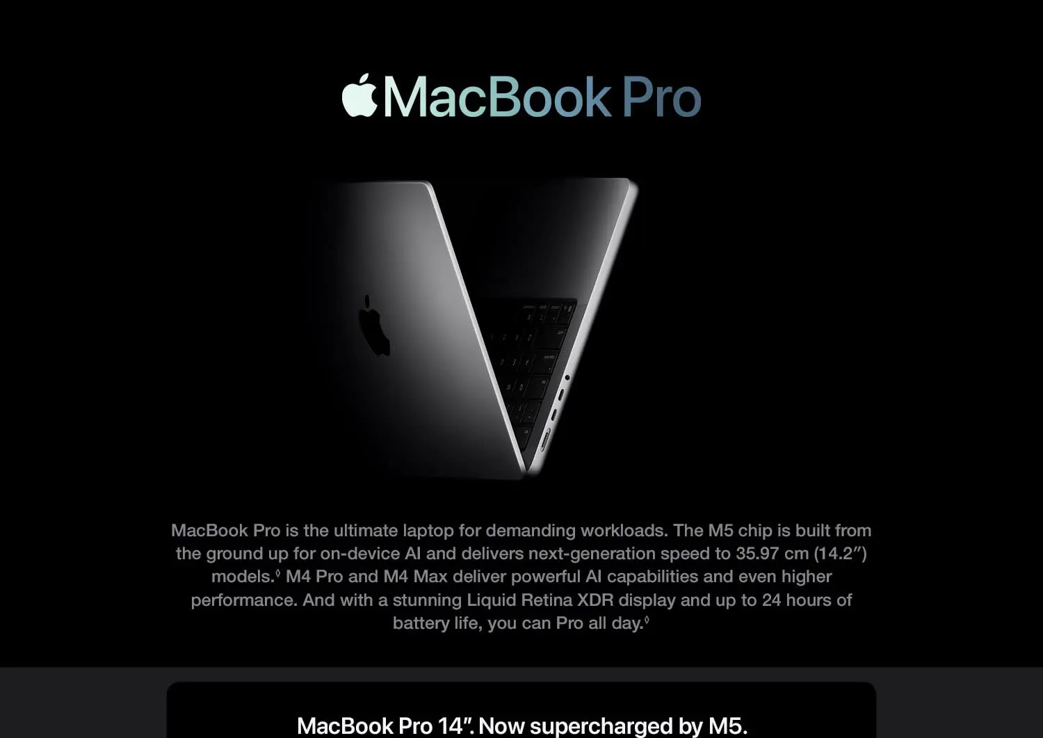 - SUPERCHARGED BY M5 — The 14″ MacBook Pro with M5 brings next-generation speed and powerful on-device AI to personal, professional and creative tasks. Featuring all-day battery life and a breathtaking Liquid Retina XDR display with up to 1,600 nits peak brightness, it’s pro in every way.